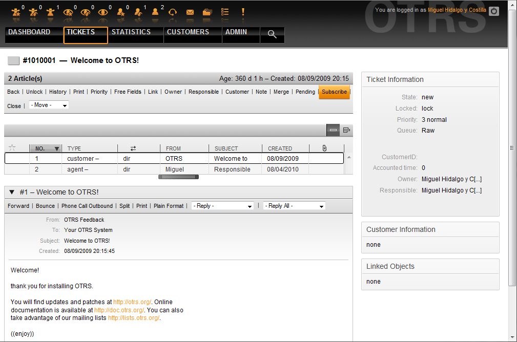 From OTRS 2.1 on, it is possible to assign a person as being responsible for a ticket, in addition to its owner. Moreover, all activities connected with the ticket can be watched by someone other than the ticket owner. These two functionalities are implemented with the TicketResponsible and TicketWatcher features, and facilitate the assignment of tasks and working within hierarchical team structures.