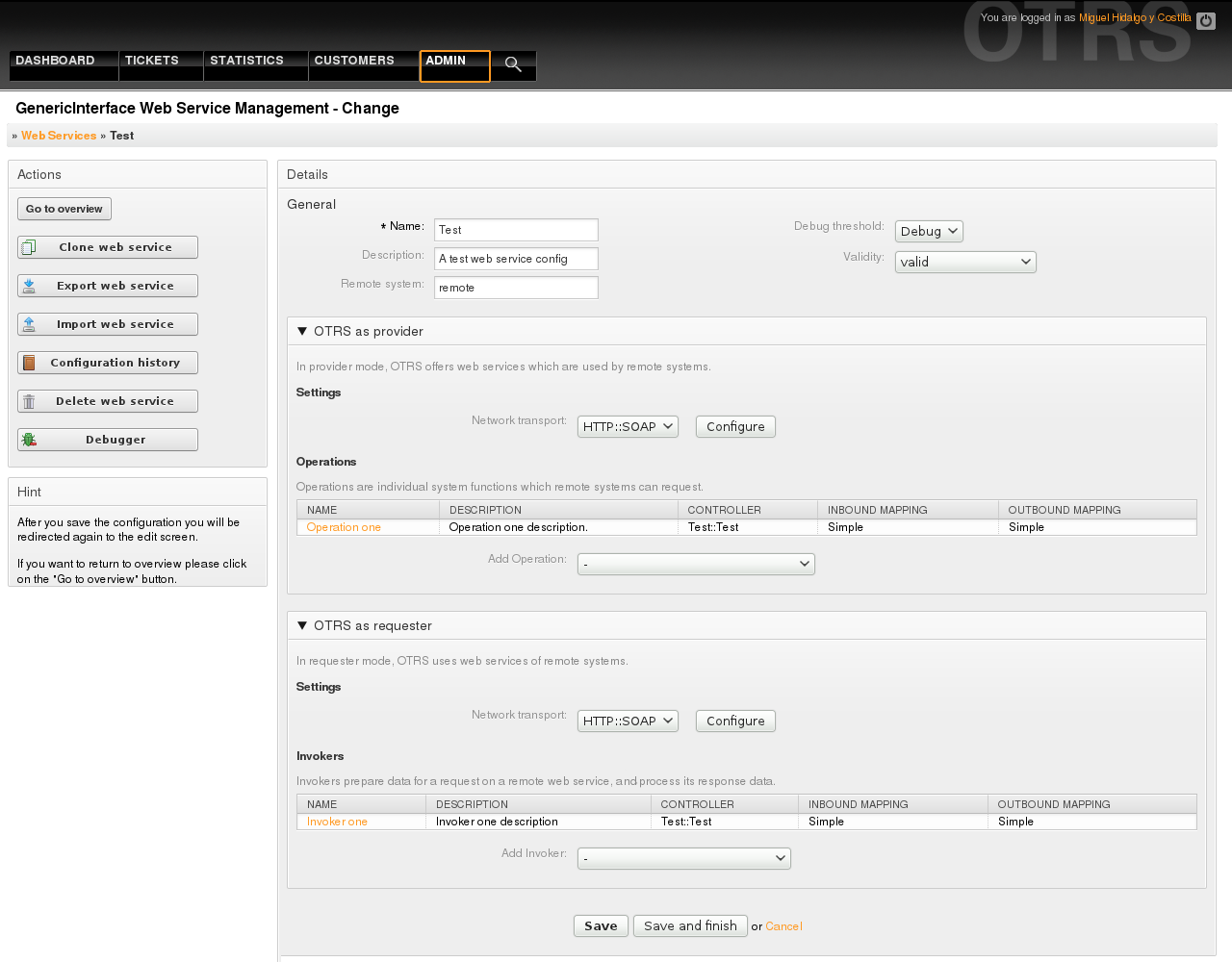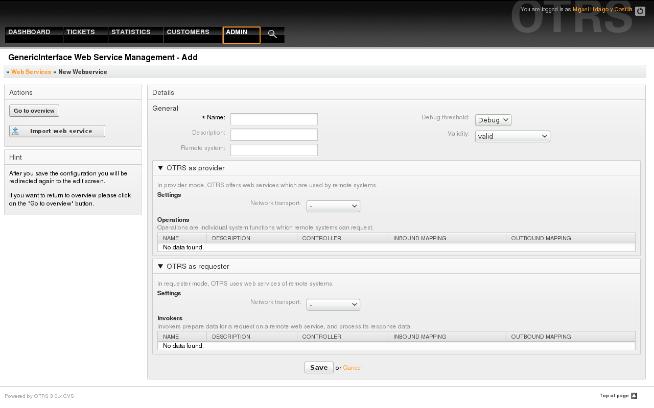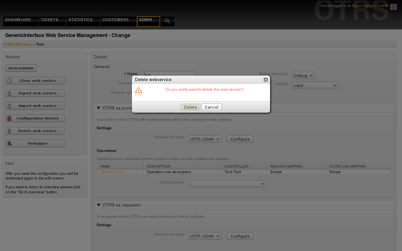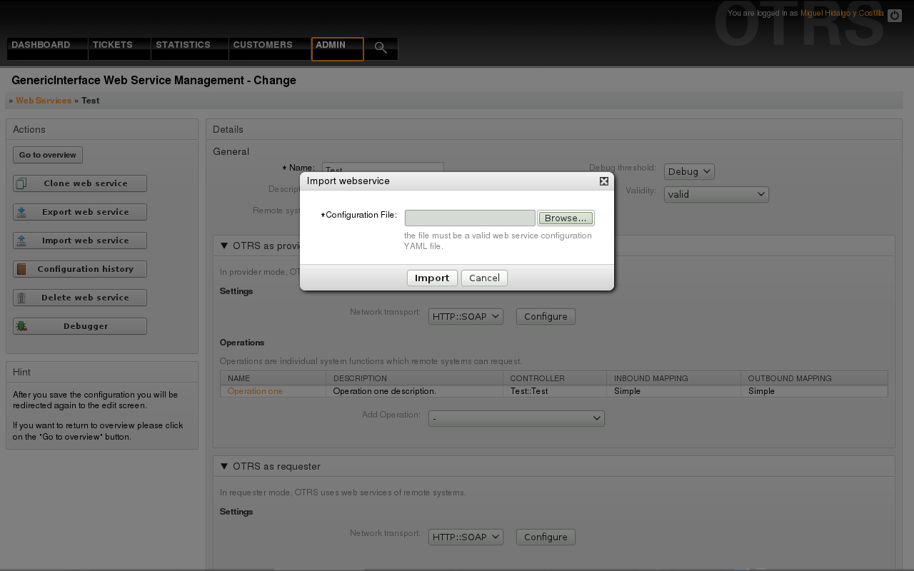 The heart of the Web Service is its configuration, where it is defined what actions the web service can perform internally (Operation), what actions the OTRS request can perform Remote System (Invokers), how data is converted from one system to the other (Mapping), and over which protocol the communication will take place (Transport)